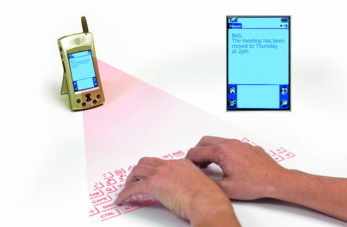 一些非常新颖的笔记本外设技术也正在源源不断向我们走来。Canesta公司在众多公司中脱颖而出,它的特色产品是可自定义功能的虚拟键盘,有了这个便携设备就不再需要传统意义上的键盘了。一个全尺寸的键盘图片会出现在物理桌面上,便携设备中的感应器可以测出你按下的是哪一个键,并通过软件进行信息通讯。