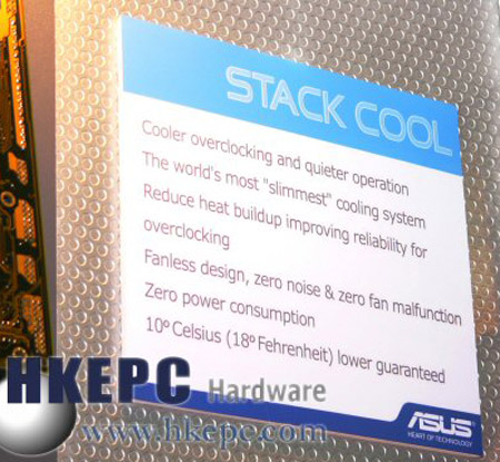 在Computex Taipei 2004 ASUSTek的展场中,Asus公开了其独家开发的Stack Cool技术,目的是要提高主机板的稳定性及超频能力,场中Asus的工作人员透露其主要是透过在主机板的底部安装一片铝片,把部份CPU的热力散至铝片上,此外铝片还有减低电子捍扰的作用。