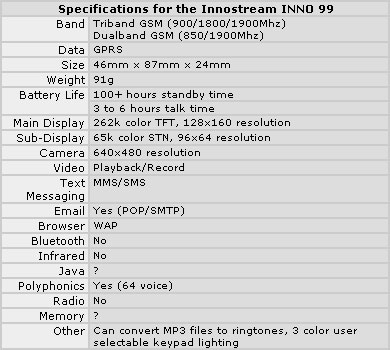 这款手机可以支持三频GSM网络以及GPRS,大小为46*87*24mm,重量仅为91g。因为小巧,所以导致无法搭配大容量电池。Inno的电池仅可以提供100小时的待机时间以及3~6小时的通话时间。彩色液晶显示屏为262K 真彩TFT显示屏,大小为128*160象素。手机内置摄像头,可以拍摄最大640*480分辨率的图片。Inno 99支持SMS/MMS功能以及无线上网,不支持Java。