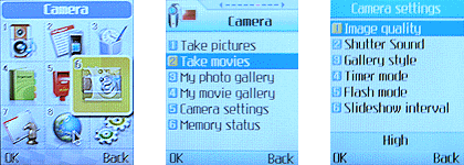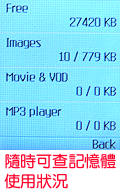 至于相机的其它设定,则必须由主选单的功能选项进入。当进入相机功能时,选项一、二可分别进入拍照或是摄影模式,选项三、四是进入相本或是影片集,选项五可详细设定相机操作,选项六则是观看内存使用容量。