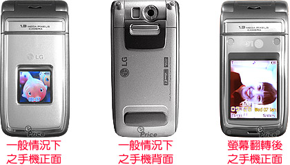 从正面来看,LG T5100 看起来与其它双屏幕翻盖手机没什么两样,无天线的酷银机身,搭配六万五千色的外屏幕,质感一流没话说。机身背面配备了目前 GSM 手机最顶级的 130 万像素相机,旁边并有补光灯来加强光源效果。