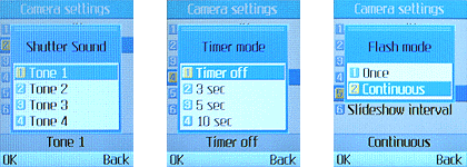 当进入选项五的『相机设定』时,又有六种选项设定,一般较常使用的是分辨率、快门音、定时自拍以及补光灯等等。值得一提的是,T5100 有四种快门音设定,拍照时可增添不少乐趣,而且补光方式可选择连续,以便在进行录像时,可长时间补光。