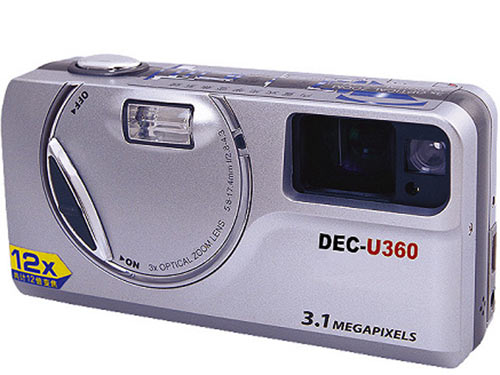 DEC U360是一款310万像素的产品,它使用的是1/2.7英寸CCD,13×56×30毫米机身上配备了3倍光学变焦,4倍数码变焦共12倍变焦功能的镜头(F2.8-4.3),采用全铝合金外壳,正面设有美观实用的防滑扣扳儿,手动电源开关,整部相机外观设计比较保守。DEC U360支持5种白平衡模式,配有1.6英寸8万真彩LCD。如果您喜欢拍摄短片的话,此相机能够较好的满足您的需求:DEC U360支持320×240摄像,内置的16M闪存,使用SD或MMC卡,使用两节AAA碱性或镍氢电池供电。