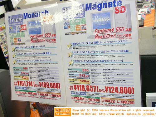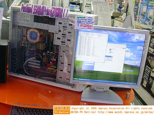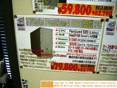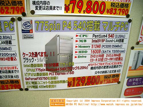 在日本秋叶原,有大量采用LGA775处理器的整机和配套设备上市。 Pentium4 550(3.4GHz)、搭配采用i915G芯片组的青云PX915G PRO主板的主机售价129800日元,折合人民币9735元。而主频低一些的Pnetium4 540(2.8GHz)主机售价79800日元,折合人民币只要5985元。Pentium4 540(3.2GHz)处理器搭配i915P主板和PCI Express借接口的GeForce PXC5750显卡的套装售价129800日元,折合人民币9735元。