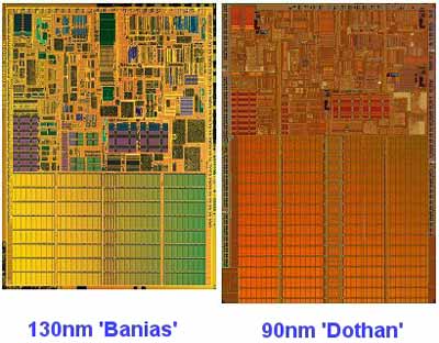 图为130纳米工艺的Pentium M与90纳米工艺的Dothan