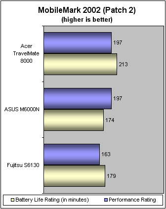 在MobileMark 2002测试中,Acer Travelmate 8000在Performance rating项中与ASUS M6000N打了个平手,都是197分。这应该是内存在作怪,因为ASUS M6000N的内存大小比Travelmate 8000要大。另外,Fujitsu的得分比较低,应该是受到了低转速硬盘的影响。在battery life测试中,Dothan显示出了其“吝啬鬼”的本色,用电量十分低,电池使用时间长达213分钟,也就是3个小时33分钟,比Fujitsu和 ASUS 的使用时间多出16?18%。但不要忘记的是ACER和ASUS的本本都是属于桌面替代型笔记本,因此采用了15英寸的大屏幕,这样的测试结果使我们不得不敬佩Dothan核心的省电性能。