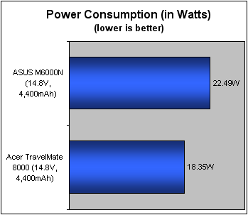 虽然最新的Dothan核心Pentium-M处理器增加了更多的缓存,工作频率也有了提高,但我们从Acer TravelMate 8000的测试中可以看到Dothan核心的电压还是要比 ASUS M6000N中的Banias核心要低。ACER和ASUS这两台笔记本都是使用了14.8V,4400mAh电池组。从电压的对比中我们就可以推断出新增加的6千万个晶体管的Dothan并不会比Banias更耗电。虽然上面的对比测试并不意味着最终的结果,因为影响耗电量的因素还有很多,比如笔记本的设计和其他电子元件的差异等等。但还是有一样是可以肯定的,那就是新久两款处理器的耗电差异可以忽略不计了,他们都可以说是目前市场上在提供同样性能下耗电量最低的处理器。