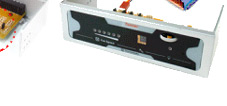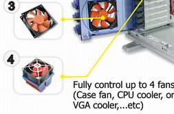 监控盒内置4MHz的收发器,支持4组风扇控制接口输出,前板有6个不同颜色的LED指示灯,在风扇低速运转状态下蓝色指示灯亮,随着风扇转速的提高,指示灯也会逐渐亮起到红色部分,使用者可以通过遥控器随意随意选择静音还是性能。