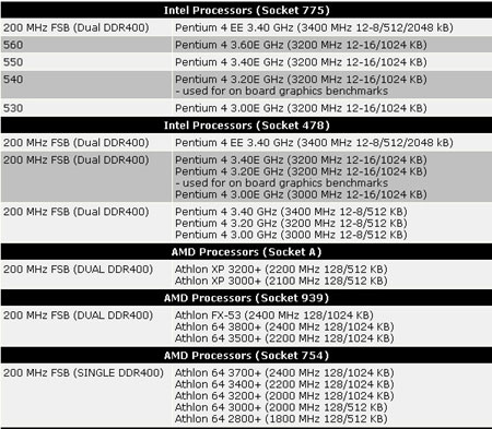 测试对比的处理器非常全面,包括:Intel Socket 775系列的Pentium 4 EE、Pentium 4E;Socket 478系列的Pentium 4 EE、Pentium 4E;AMD Socket A系列的AthlonXP;Socket 939系列的Athlon FX、Athlon64;Socket 754系列的Athlon64。具体可见下表: