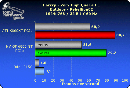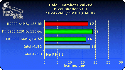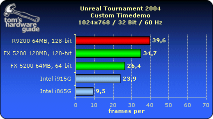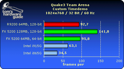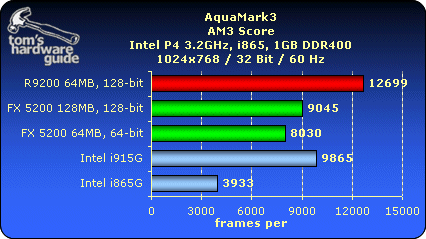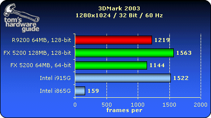 测试i915G整合芯片组的图形核心性能,对比采用了Radeon 9200、GF FX5200,Intel i865G的整合图形核心,测试成绩如下:
