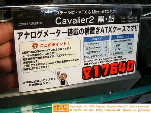 COOLERMASTER的新款机箱Cavalier 1和Cavalier 2在日本秋叶原亮相,两者分别售价1350元和1250元。这两款机箱除了合理的架构和超小的体积外,最大的特点是在面板上有一个声压指示器。可以随着音乐声压的变化摆动,让机箱也极具动感。Cavalier 1体积435×202×500mm、Cavalier 2体积135×438×420mm。电源方面两者分别搭配350W和300W电源。