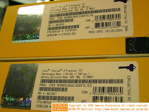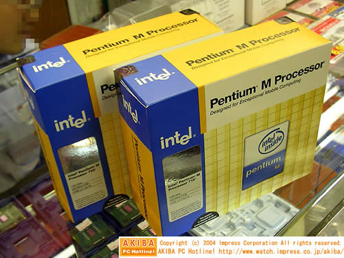 采用Dothan核心的Pentium M进入零售市场,Dothan核心相比之前的Banias核心Pentium4 M性能大幅度提升。新型的Pentium M725(主频1.6GHz)售价2300元,715(1.5GHz)2000元,755(2GHz)和745(1.8GHz)将在稍后登场。725和715采用0.09微米制造工艺,FSB400、2MB二级缓存,全速运行时的电源时1.34V。