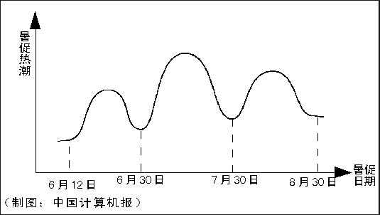 暑期促销生命周期 今年的暑促显然应该是6、7、8三个月,这三个月当中,又有波峰和波谷。一般来说,6月7号、8号高考结束是暑促的开始,接下来的6月会有一个小高潮;等到7月全部学生放假后,将迎来暑促最高峰;7月底、8月初可能有所回落,直到8月中旬暑假结束前,又会有一个学前采购小高峰出现。