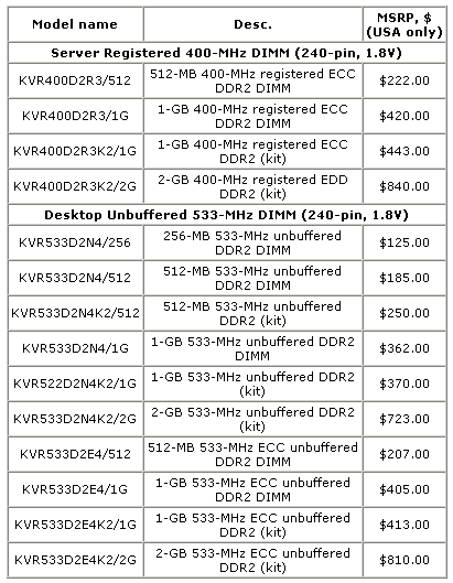 Kingston发布了支持最新的Intel 915G和925X芯片组的DDR2-400/533 SDRAM。下面报价的单位是美金。