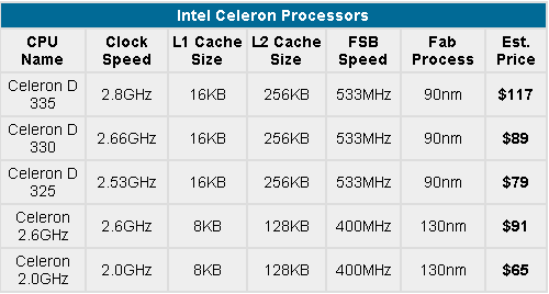 成绩我们已经看到,Prescott核心非常适合Celeron D,它不仅在性能上超越老版Northwood核心Celeron,并且已经可以和Athlon XP 2600+以下的产品抗衡。在价格方面,目前的Athlon XP 2500+和2600+均在80美元以下,而Celeron D 325/330/335价格分别为79/89/117美元,这样的定价在低端市场还是不错的,看来Intel也开始注重性价比了。