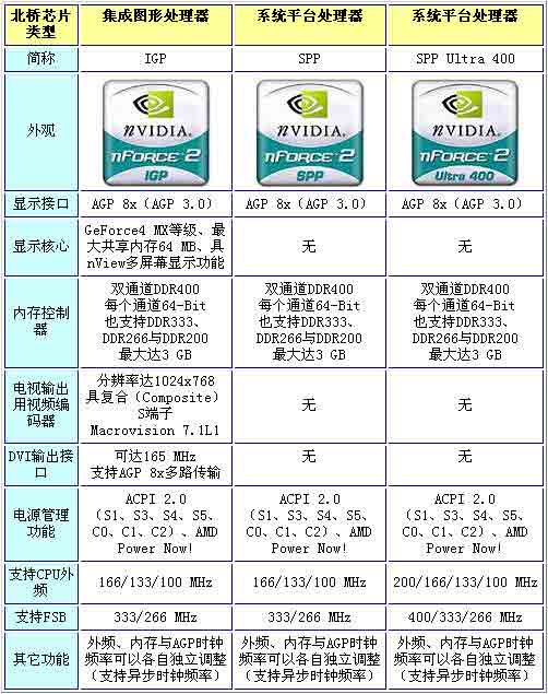 nForce2 Ultra 400也就是平时大家说的C1版核心的SPP。从表中可以看出,SPP和Ultra 400差别不大,主要区别在于Ultra 400正式支持200MHz的CPU外频和400MHz的FSB。在这里之所以说”正式支持”是因为之前出的很多nForce2 SPP主板都可以上到200MHz外频并支持DDR400内存。当然,从稳定性上来说Ultra 400应该会好一点,毕竟是官方声明支持的东西。