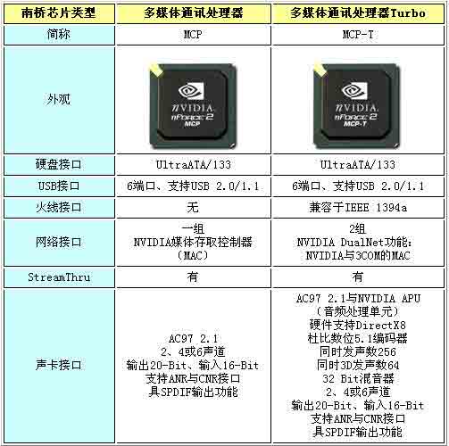 从表中可以看出,南桥的MCP与MCP-T的基本特性也一样,T的含义nVIDIA官方解释为Turbo的意思,但是这个Turbo在南桥处理芯片中并不意味着高速,而是意味着集成更多的功能(南桥控制芯片的主要用途还是在于功能化的集成处理)nForce2 MCP-T相对于nForce2 MCP而言主要有三点的差别:MCP-T提供内建IEEE1394火线接口以及一个独立的网络适配控制单元(这也就意味着nForce2主板可以同时提供两块网卡的功能设计)除了以上两个差异以外,MCP-T和MCP的不同之处还在于MCP-T内建APU(Audio Processing Unit,音频处理单元),拥有硬件杜比5.1解码技术,而MCP则没有。值得一提的是APU曾用在Xbox游戏机上,其出色的音效受到众人的推荐。另外南北桥芯片之间通过HyperTransport总线进行数据传输,可达到800MB/s的带宽,大大超出威盛的V-Link、硅统的妙渠(MuLTIOL)533 MB/s传输速率。