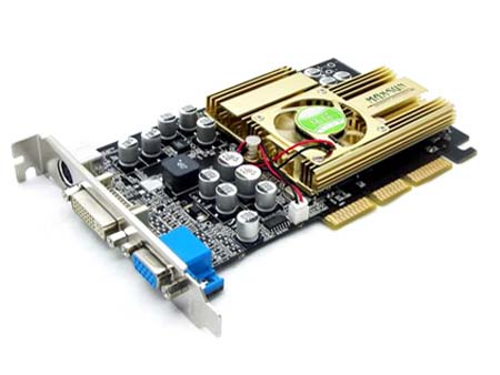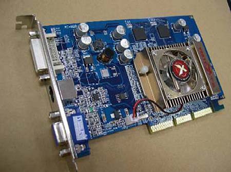 宇派FX5500,蓝色PCB板,加上金黄色散热器,看起来还是比较让人舒服。显存方面,它使用的是4粒现代3.6纳秒、mBGA封装显存颗粒,共计64MB/128bit,其核心和显存频率分别为270MHz和400MHz。和其它品牌GF FX5500显卡相同的是,DVI、D-Sub以及TV-Out三种显示接口一应俱全。