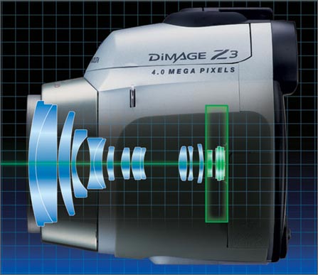 Z3为400万像素长焦机型,所配备的光学变焦达12×,焦距范围为35mm~420mm,同时加入了 AS(Anti-Shake防抖动)功能。从这三项简单的性能参数我们可以想象,或许柯美根本没有把只有区区300万像素的Canon S1 IS放在眼里,Z3显然是以Panasonic FZ10为假想对手所推出的,意图非常明显??柯美欲撵走Olympus,踩住松下称霸高倍变焦机型市场。