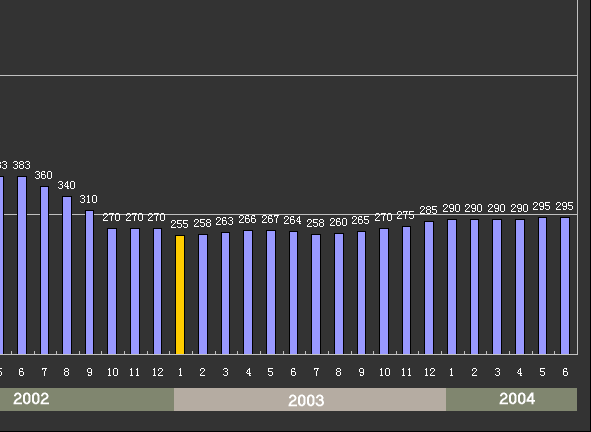 从图中我们可以看出,01年秋季到02年夏季这一阶段,15英寸面板的价格同样是一路攀升,其幅度也相当可观,达到了近70美元。只不过当时我国消费者对液晶显示器的关注度还相对较低,因此上游市场的波动并没有给国内零售市场带来太大影响。