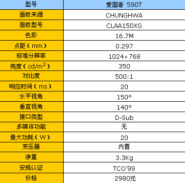 严格来讲,爱国者这款590T并不能算是一款新品,它早在2003年春天就已经被推向市场。但即使我们今天来审视590T的各项指标,它在主流产品中也依然突出??500:1的对比度、350nits的亮度都高于现在15英寸LCD的平均水平。