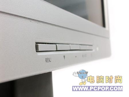 OSD按键排布在下边框正中,长条状的按键同为银灰配色,与机身融为一体。通过试用,我们感觉按键还是有些生涩难按,而且所有的按键均被设计在了一个凹槽之中,而凹槽过窄的宽度又势必会对使用构成一定影响??我们无法轻易的将按键触动到位,因此也就需要更费力的去完成操作。