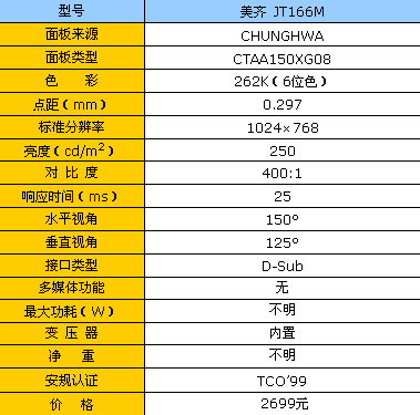 美齐的显示器产品向来以过人的性价比优势赢得消费者的认可,而本次送测的这款JT166M也沿袭了美齐的一贯作风,以低价格切入市场。