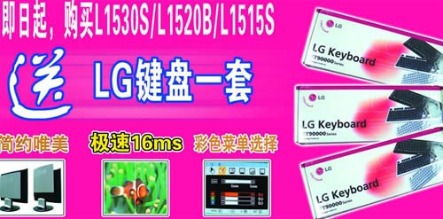 作为液晶大厂LG是不会放过今夏的液晶市场的,其促销方式也是通过送礼:即日起凡购买LG指定的几款液晶显示器均可获赠LG键盘一套。LG液晶显示器的价格本来就不高,此次购买还有赠送键盘,是极具性价比的产品。