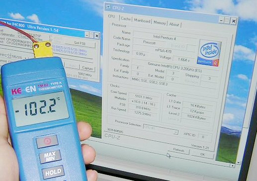 新加坡的一位电脑发烧友通过压缩机使用的R22将Prescott核心的奔腾4 3.2GHz处理器超频到了5.1GHz。