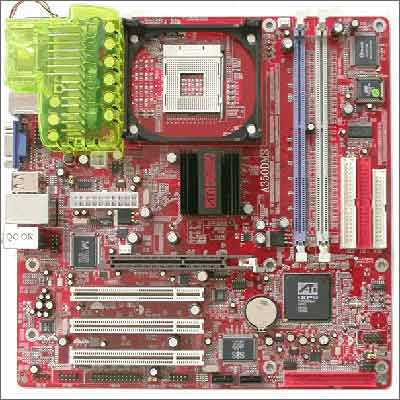 这是目前发布的唯一基于9100 IGP PRO的主板,采用RS350+IXP150芯片组,整合第三方SATA芯片,支持SATA RAID。虽然做工比较节约,但是到也功能齐全。图上的绿色的是主板采用的神奇散热管道技术(MagicDUCT)。此项技术把多达9颗大容量直立电容、三组电感以及场效应管包含在散热管道之中,在后部形成一个强力的风道,可以有效地带走处理器热量,这款A350DMS定价799元,加一元可获得东方讯捷科技iVOGUE PD-A128A闪盘,性价比还算不错。由于带PRO的9100 IGP改进较大,搭配Prescott处理器的性能直逼Intel 875P芯片组,所以笔者推荐大家关注这款芯片组的大厂产品。