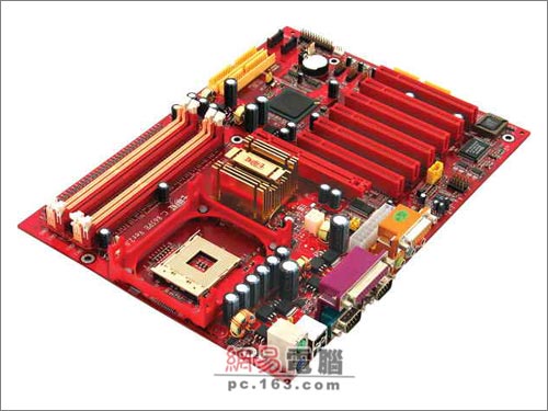 七彩虹显卡是以性价比高而出名,那么七彩虹的主板呢?答案是肯定的,它的主板同样是性价比高。865PE+ICH5组合,红色PCB板搭配红色插槽,供电部分采用了三相电源回路,整合6声道ALC 650音效处理器。支持PAT性能加速模式"Memory AccelerATion Mode"。公开报价599,具有相当的竞争力。