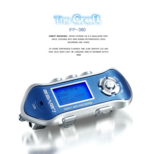 看到这款iFP-380T是不是有些似曾相识的感觉?呵呵……从外观上来看,该机似乎同经典的iFP-180TC有着几分相似,但是实际上该机可是全新设计的产品。不得不承认INNO Design的设计能力,虽然并没有采用金属材质做为外壳材料,但是凭借着精致的加工工艺和独特的设计理念,使得iFP-380T虽然少了几分质感,但是超轻的份量和大气的外观同样让人着迷。该机采用了更炫更COOL的蓝色背光液晶屏,具有四行文字显示能力,可以提供你所需要的信息,包括歌名、歌手名称、剩余电量、均衡器模式(EQ)等等。跟你在个人电脑上的使用一样,iFP-380T提供方便的浏览功能,其支持创建多达500个文件夹, 1500个文件,同时支持播放排序,使得管理易如反掌。12mW的耳机输出功率让iFP-380T具有更为出色的音质回放效果,难怪不少玩家都将iRiver(艾利和)产品视为音质最好的MP3播放器。