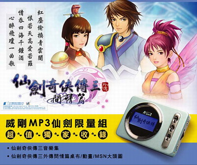《仙剑奇侠传三外传——问情篇》8月6日将于两岸三地同时推出,大宇公司与威刚科技合作共同推出仙剑限量版MP3,在这款仙剑限量版MP3内不但内建有仙剑系列音乐,更收录有问情篇的精美壁纸、精彩动画以及可爱的MSN头像。