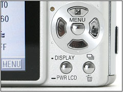 机身背面的布局很简单,一个四向控制器,同时它还是拍摄模式控制设置。这点和Lumix其他相机一样。FX7和FX2的亮度很高的LCD叫做"Power LCD",按住DISPLAY键超过一秒,LCD的亮度就会明显增加。这样的设计就是为了适应明亮的室外环境。