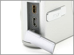 在机身的右边是一个橡胶盖,上面是一个黄色塑料,这样是为了盖起来后能和整个相机风格一致。里面是一个AV/USB接口和DC-IN接口。