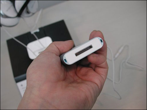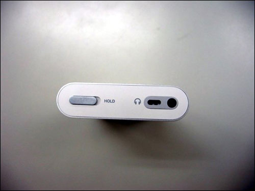 IPOD机身顶部位置设有遥控器接口,耳机接口和HOLD键,底部设有电源和数据传输共用 的插口,声音调节在侧面位置。
