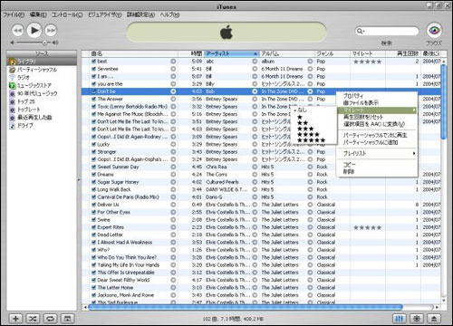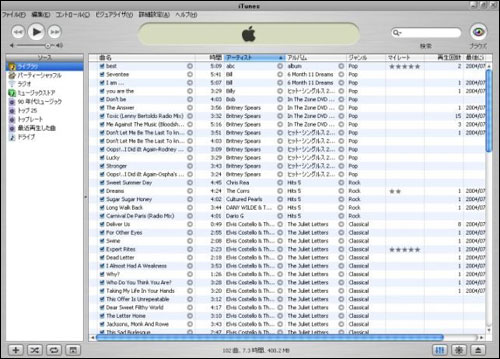 iTunes界面包含歌曲名、时间、艺术家、相簿、类型、采样率、喜好程度(以1~5个 ★表示),点播率最高的25首曲目等。