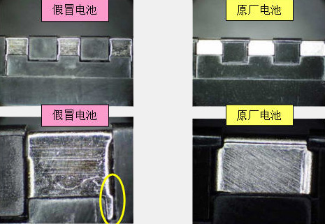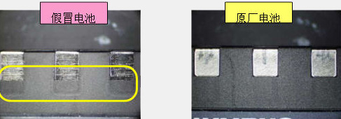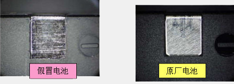 4. 假冒电池与原厂电池相比电极触点部分露出较多,边缘还有突出部分。