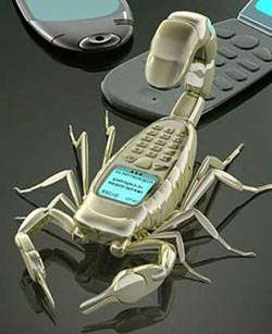创意闪光点:这又是一款在外形上做文章的手机,猛一看还以为是一个机械的蝎子玩具呢,仔细一看,原来也是一款手机。这个手机和以前的三菱小菲一样,属于又窄又厚手机,蝎子的脚和尾巴从手机的底部向外延伸,很有意思。这种蝎子的造型对于使用者来说好像没有什么益处,反而有点累赘,接听或是拨打电话也不是很方便。呵呵,不知道会不会真的有这么一款造型的手机面市发售。