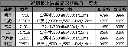 下面就来看看最近价格下滑比较大的一些液晶都有哪些,考虑到现在16毫秒、12毫秒反应速率的液晶已是主流,而价格又不比25、20毫秒的液晶贵多少,在此就只对该部分的液晶做推介。仔细看好了,或许其中就有你中意的那款机型。