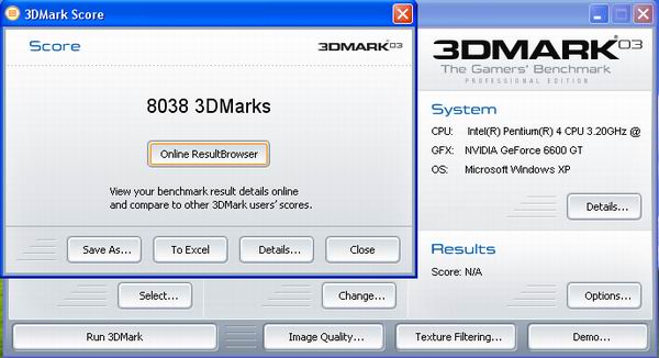 此外,NV43整合8条像素渲染管线,虽然无法同高端的12条或者16条管线的产品相比,但是应付主流的应用已经足够。上图就是曝光的GeForce 6600GT显示卡的3Dmark 03的测试结果,高达8000分的得分证明其拥有出色的DirectX 9.0应用性能。