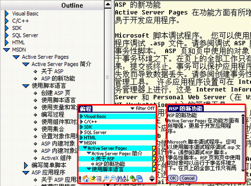 上图即是Bonsai这款常用的项目管理和资料搜集软件的应用情况。Bonsai具有Windows 端和Palm端,能够在每次同步时保证计算机和Palm中的资料库统一。使用Bonsai可以有效管理大量的文本资料并且能够进行分类整理。比起把文件零零散散得到处乱放,用统一的树状记事本无疑是更好的方法。笔者就经常搜集一些形势政策的文章放在里面。等到每学期写烦人的形势政策论文时,翻翻这些资料剪剪贴贴就是一篇足以交差了。