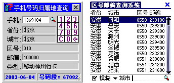Palm上还有一些实用的生活资料查询软件。比如手机归属地查询可以根据手机号查到其所属的城市和类型。常用的区号邮编查询则提供了全国各地的区号邮编信息。值得一提的是Busline这款公交查询软件,与PC上常用的“中国公交查询系统”类似,只要输入两个站名就能自动找出乘车和转车的最佳方案,非常适合在外地上学的朋友出行。