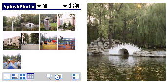 在Palm上放一本电子相册,随时把家人照片或者欢乐的回忆带在身边看看,Palm上有非常多的图片浏览器可以使用,如ACDSee Mobile,RescoViewer,SplashPhoto等等。这些软件各有特色,按照个人的喜好选择即可。上图为使用SplashPhoto浏览笔者学校的风景照片。