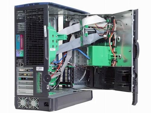 存储方面,这次Dell竟然给XPC一次就配备了两台400GB SATA硬盘,这也是目前你所能买到的最大容量的硬盘了。你可以把他们配备成RAID0或1的形式,同时我们也注意到,这两块硬盘全部都固定到了能掀开得机箱侧面板上,采用这样的设计能帮助用户在打开机箱配置硬盘时,不用把手伸进机箱内部进行困难盲目的摸索,侧开的机箱门很自然的就把硬盘直接暴露在我们面前。