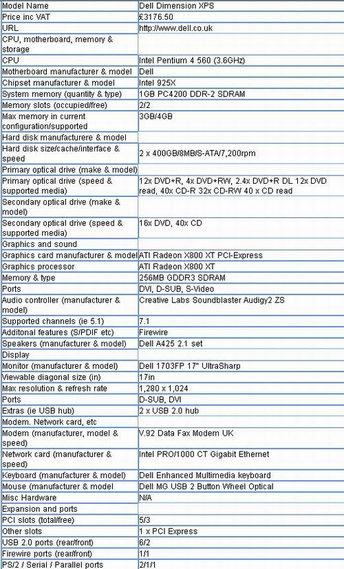 显示方面,最高端的ATI Radeon X800 XT是当然的不二之选,我们获知Dell在XPC上只会采用ATI的显卡,所以Nvida的fans可能会觉得有点失望了。XPC搭配的声卡同样也是顶级的,Audigy 2 ZS能提供完美的EAX 4支持和7.1声道输出。机器配置这么好,显示器当然也不能落后,XPC配备的1703FP液晶显示器提供了足够的亮度和足够快的响应度,同时显示器上也提供了XPC的第9、10号USB端口。Dell Dimension XPS详细配置如下: