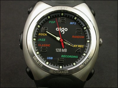 从整体的做工来看,除了表身稍显有些厚外,其他部分还算比较的精细。金属表圈和上盖、橡胶的表带做工都比较细腻,搭扣的设计也比较简洁大方,佩戴起来很舒适。基本功能包括了:MP3播放、录音、USB存储器。从表盘也可以知道还可以进行pop, rock, classical, jazz的效果调节。128M也标明了其容量。