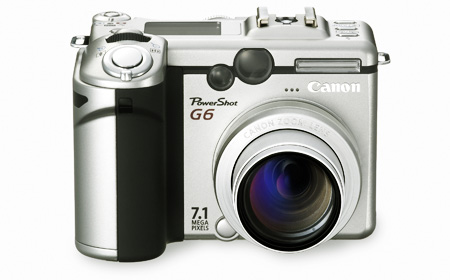 Canon 于 8/20 正式发表 G5 的后继机种: PowerShot G6,这款 7.1MP(710万像素)、4倍光学变焦、LCD 屏幕可外翻自拍的机种,也是 Canon首部 7MP 等级数码相机。从外观上来比较,G6 也比 G5 轻巧许多。