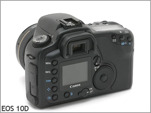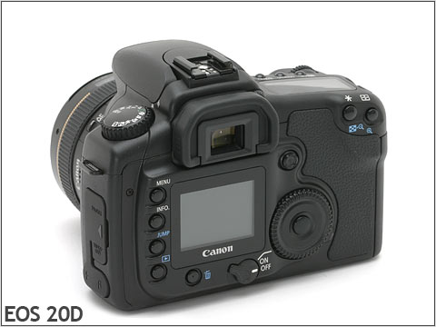 再细看的话,可以发现10D卡口左侧的凹槽在20D上被取消,20D机顶弹出闪灯的宽度也要比10D来得窄,10D手柄上凹陷的手指槽也取消了。