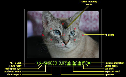 取景器内设置了一个合焦指示环合9个对焦点。使用中的对焦点上高亮显示,您可以很清楚地知道所选择的对焦区域。自定义功能可以让你开启或关闭自动对焦点标记功能。